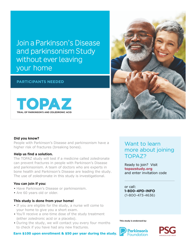 The study is called TOPAZ, which stands for Trial Of Parkinson’s And Zoledronic Acid.